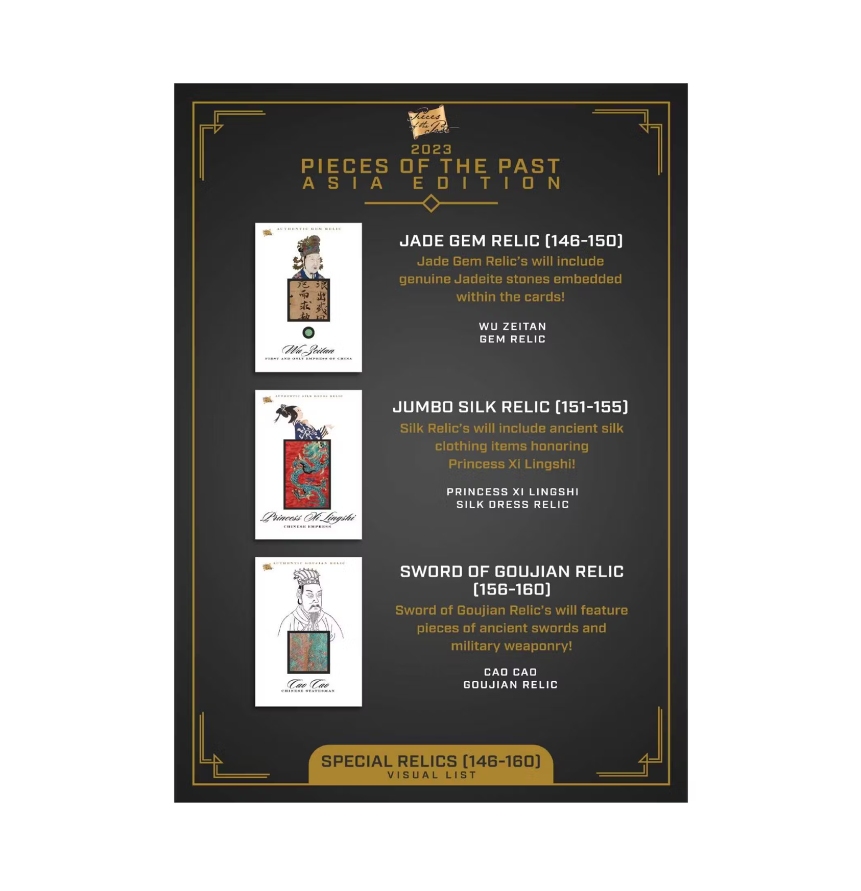 - Look for Relic Cards featuring ancient documents, manuscripts, coins, silk dresses, swords, low-numbered cards, inserts, cut autographs, and more!
