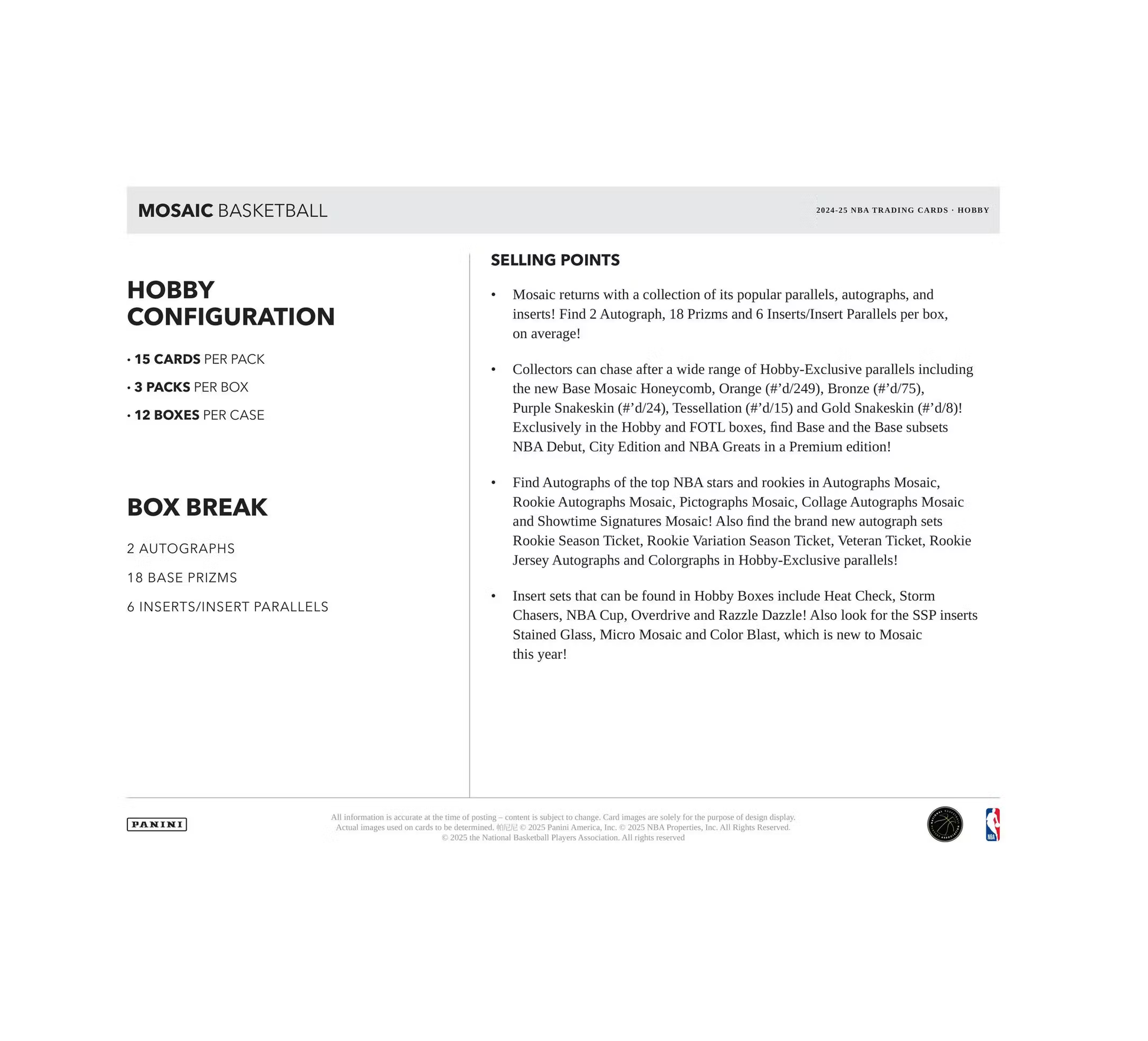 - In summary, the 2024/25 Panini Mosaic Basketball Hobby boxes are loved for their stunning design, superior card quality, and the exhilarating collecting experience they provide. The August 2025 release is eagerly anticipated by the collecting community.