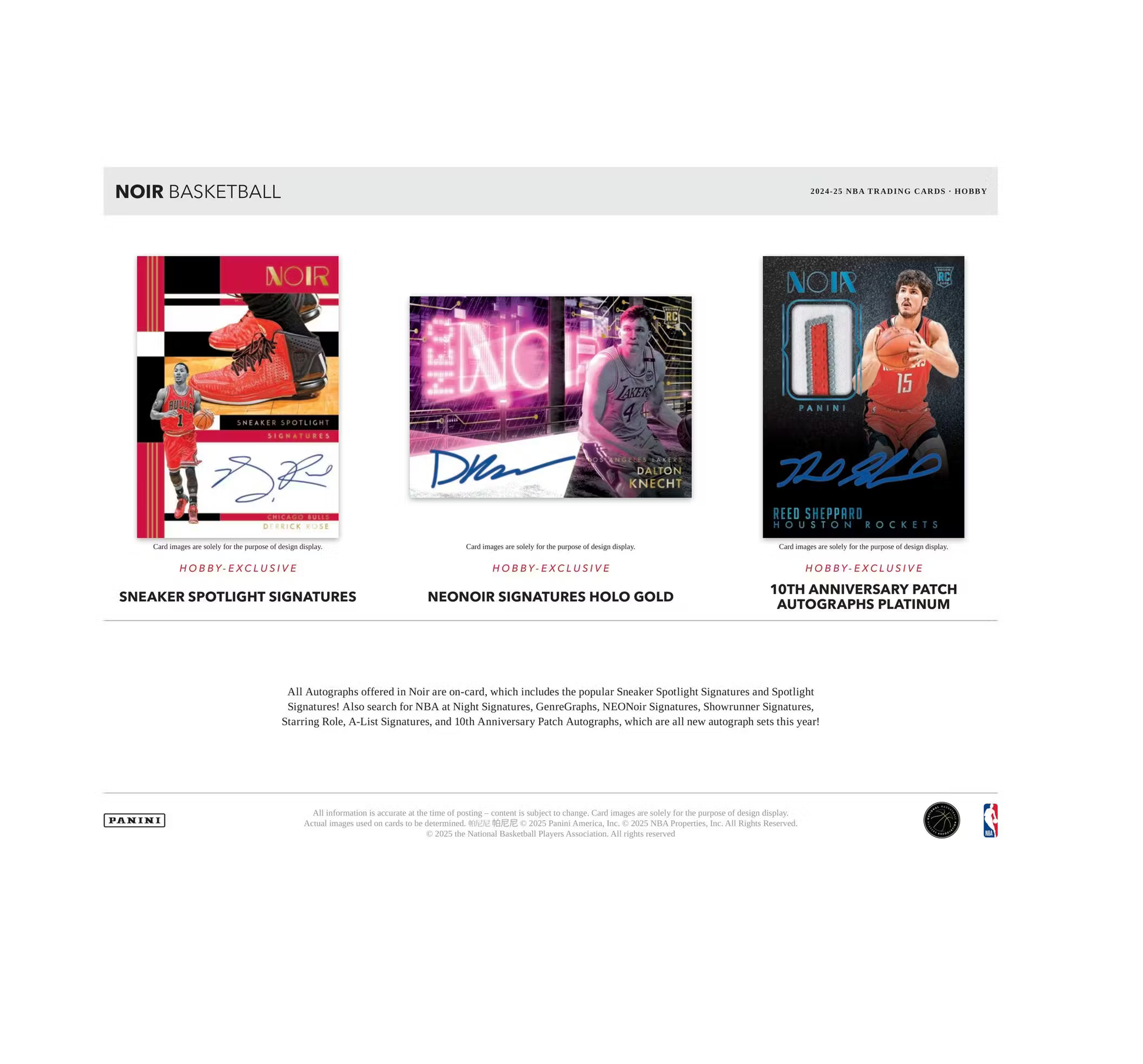 - Noir Basketball returns for the 2024-25 season, and offers quality designs and on-card Autographs in which collectors can find 3 Base/Base Parallels or Inserts, 3 Memorabilia cards, and 4 Autographs per box!