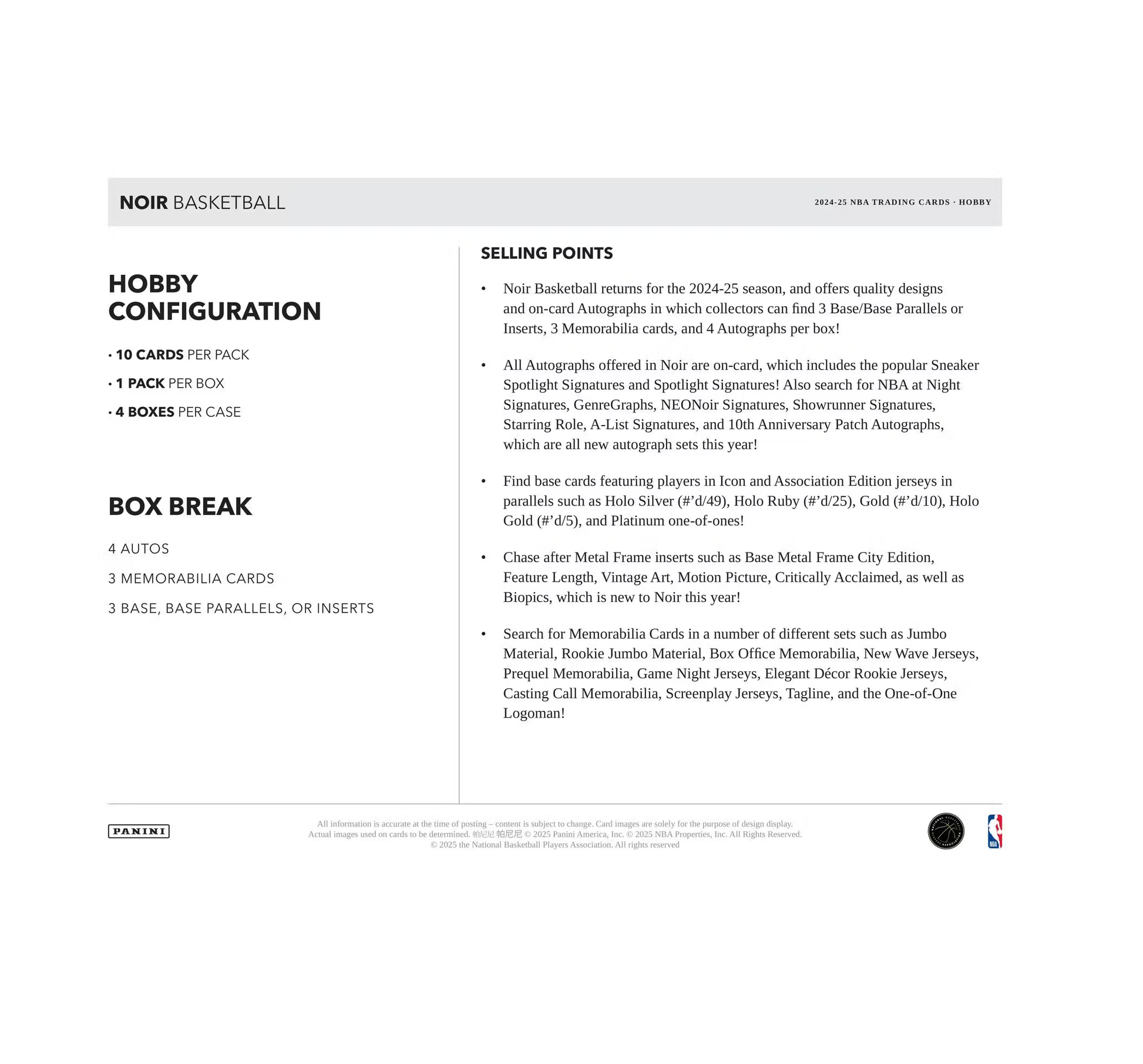 - Noir Basketball returns for the 2024-25 season, and offers quality designs and on-card Autographs in which collectors can find 3 Base/Base Parallels or Inserts, 3 Memorabilia cards, and 4 Autographs per box!