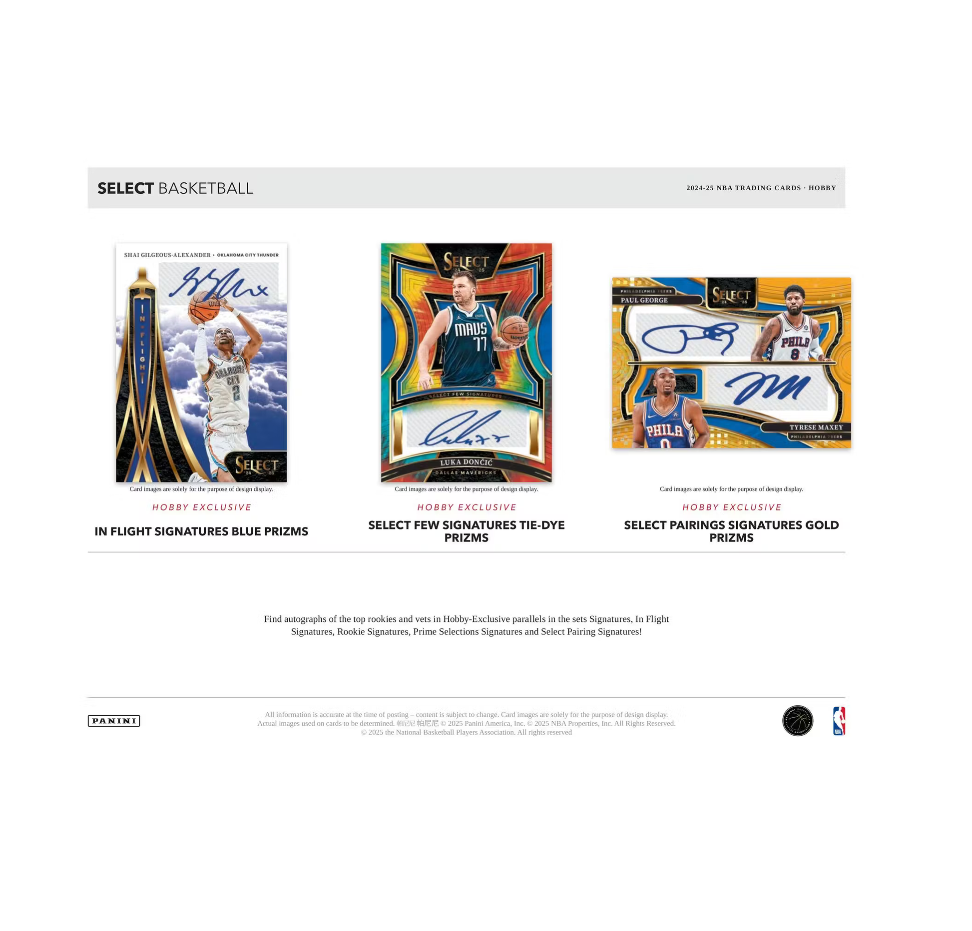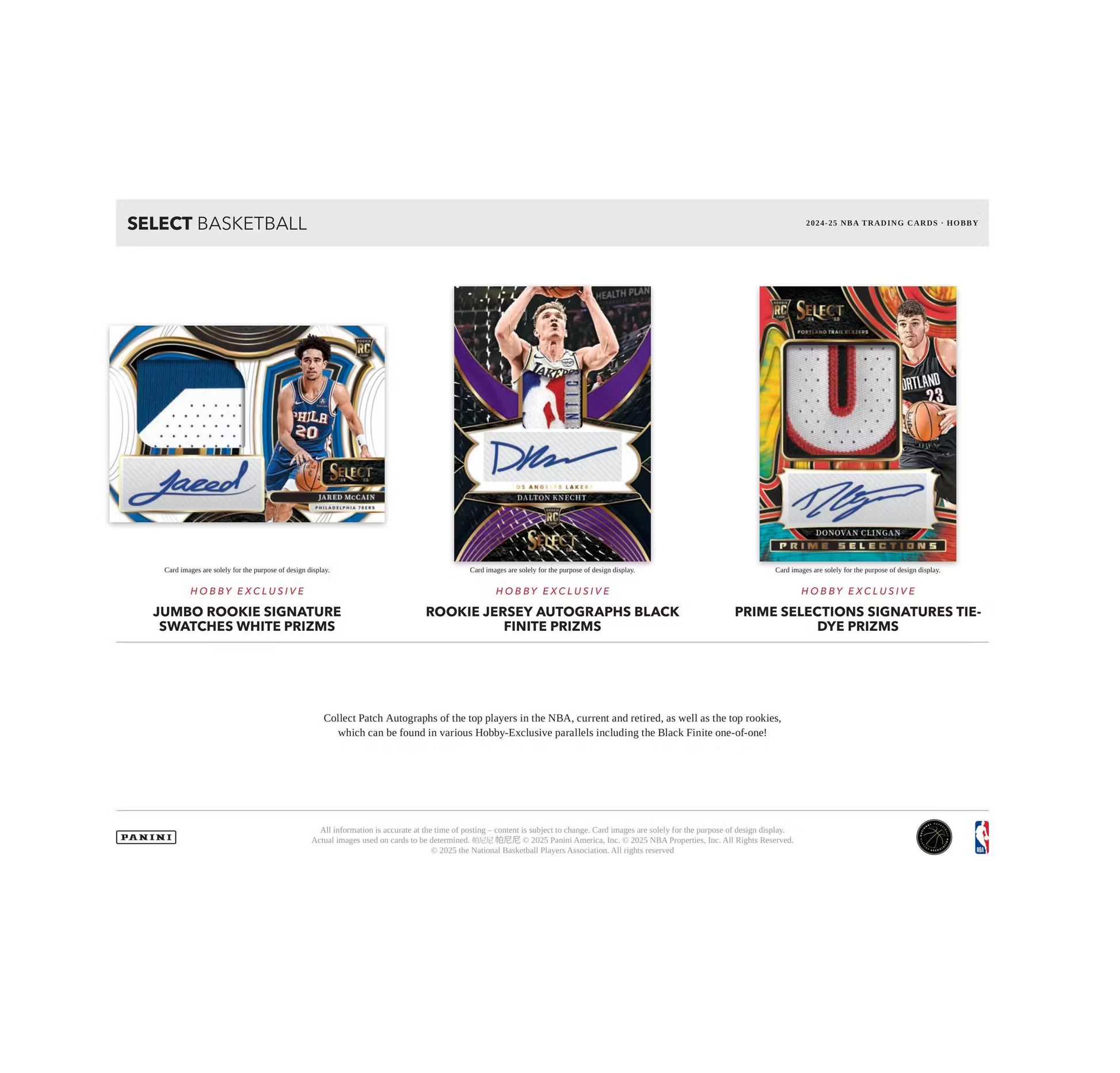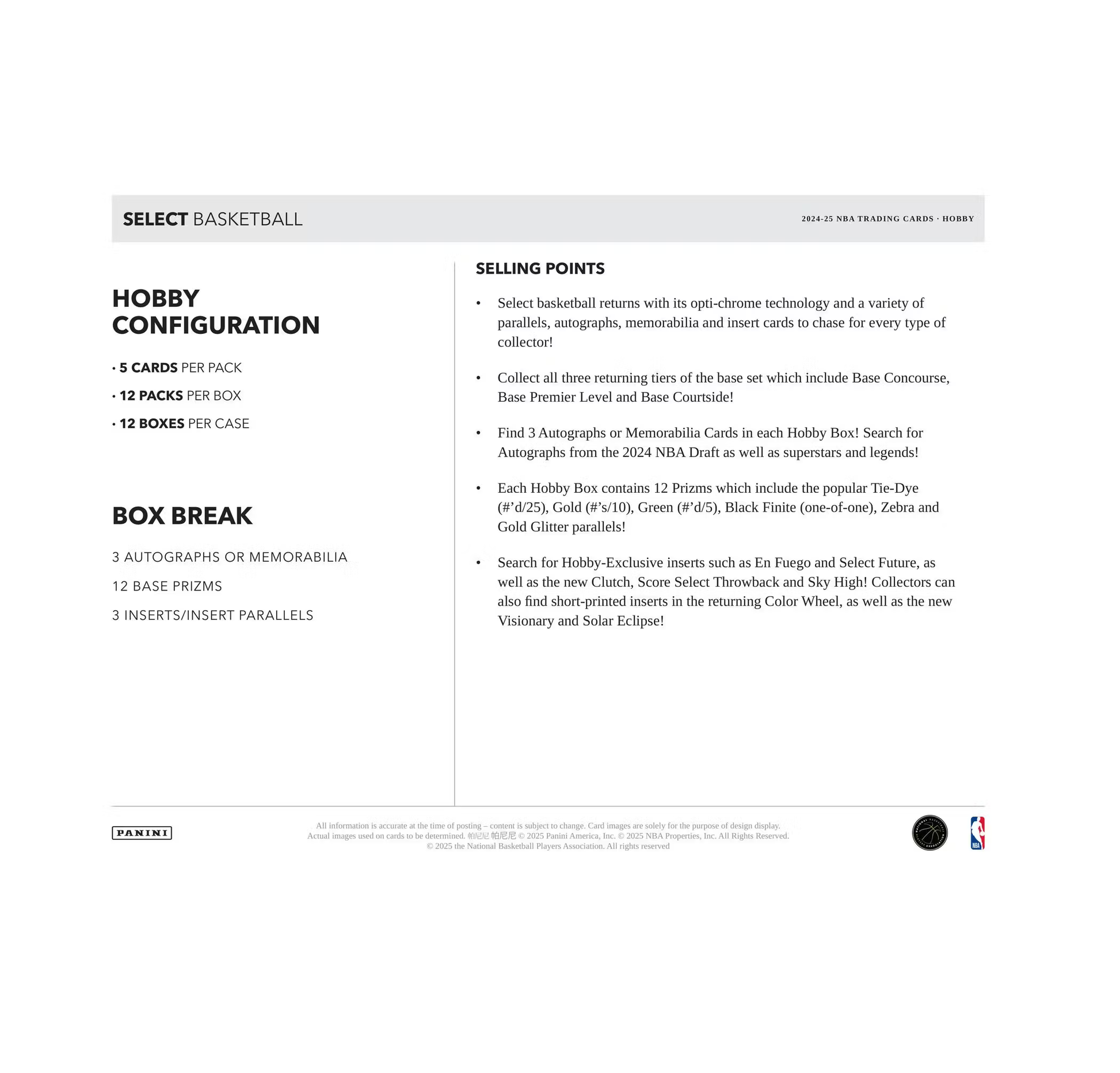 - The 2024/25 Panini Select Basketball Hobby boxes, anticipated for release in May 2025, are generating significant buzz among collectors. These hobby boxes are especially loved for their high-quality design and the premium collecting experience they offer.