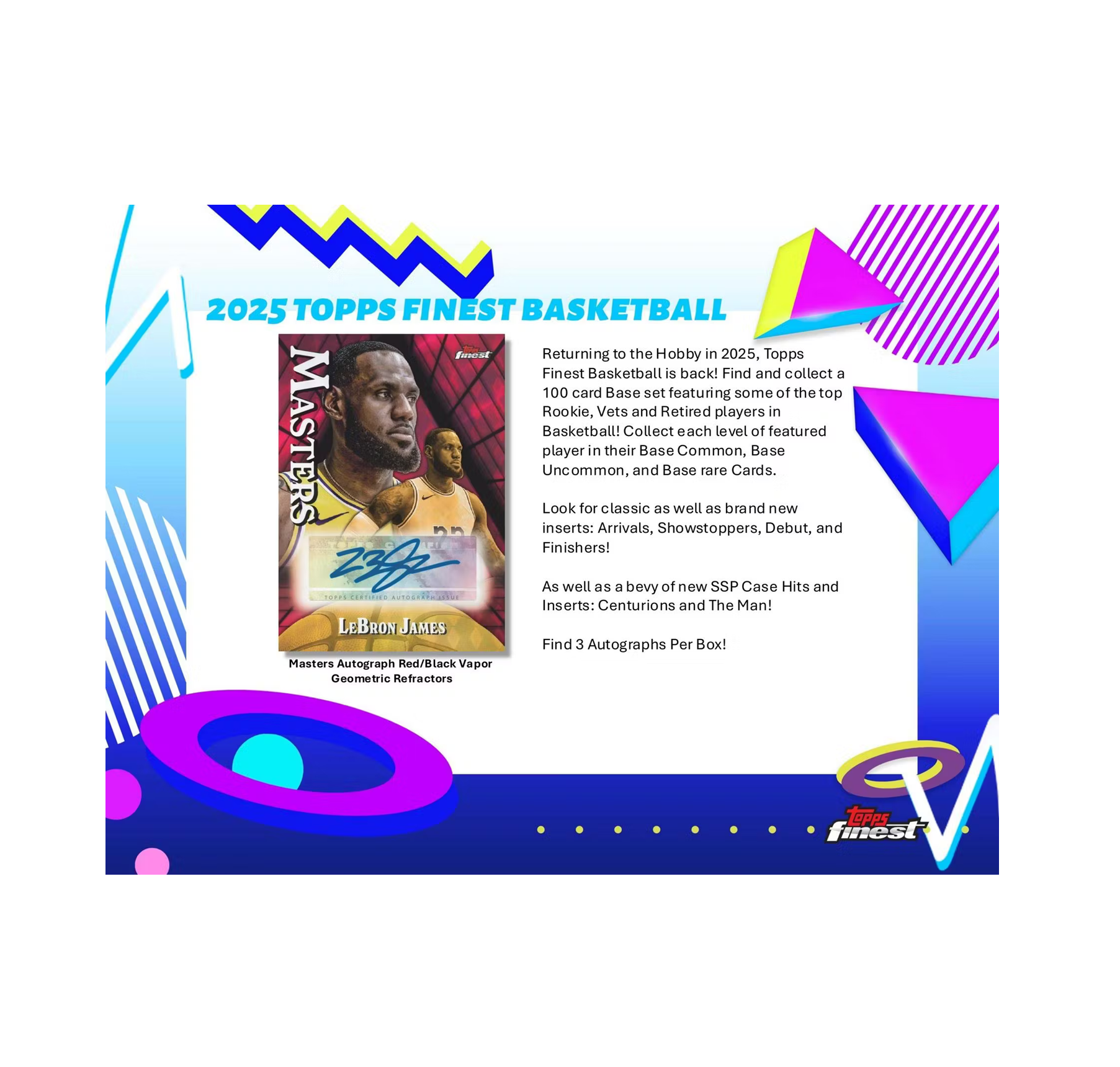- Returning to the Hobby in 2025, Topps Finest Basketball is back! Find and collect a 100 card Base set featuring some of the top Rookie, Vets and Retired players in Basketball!