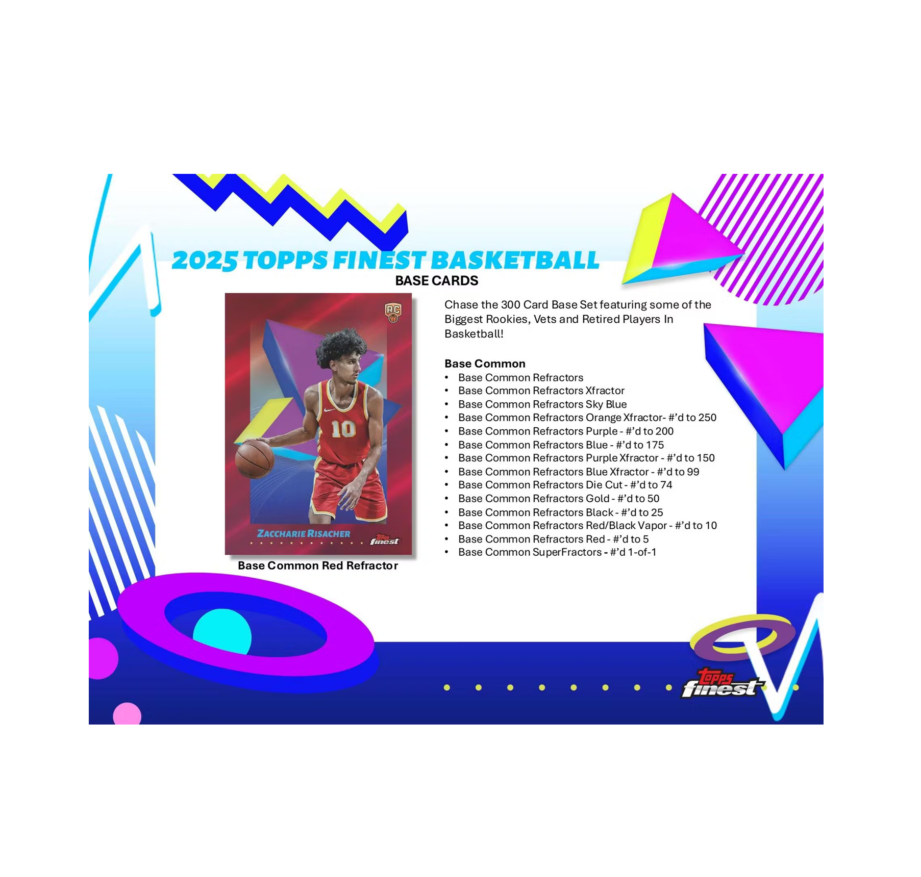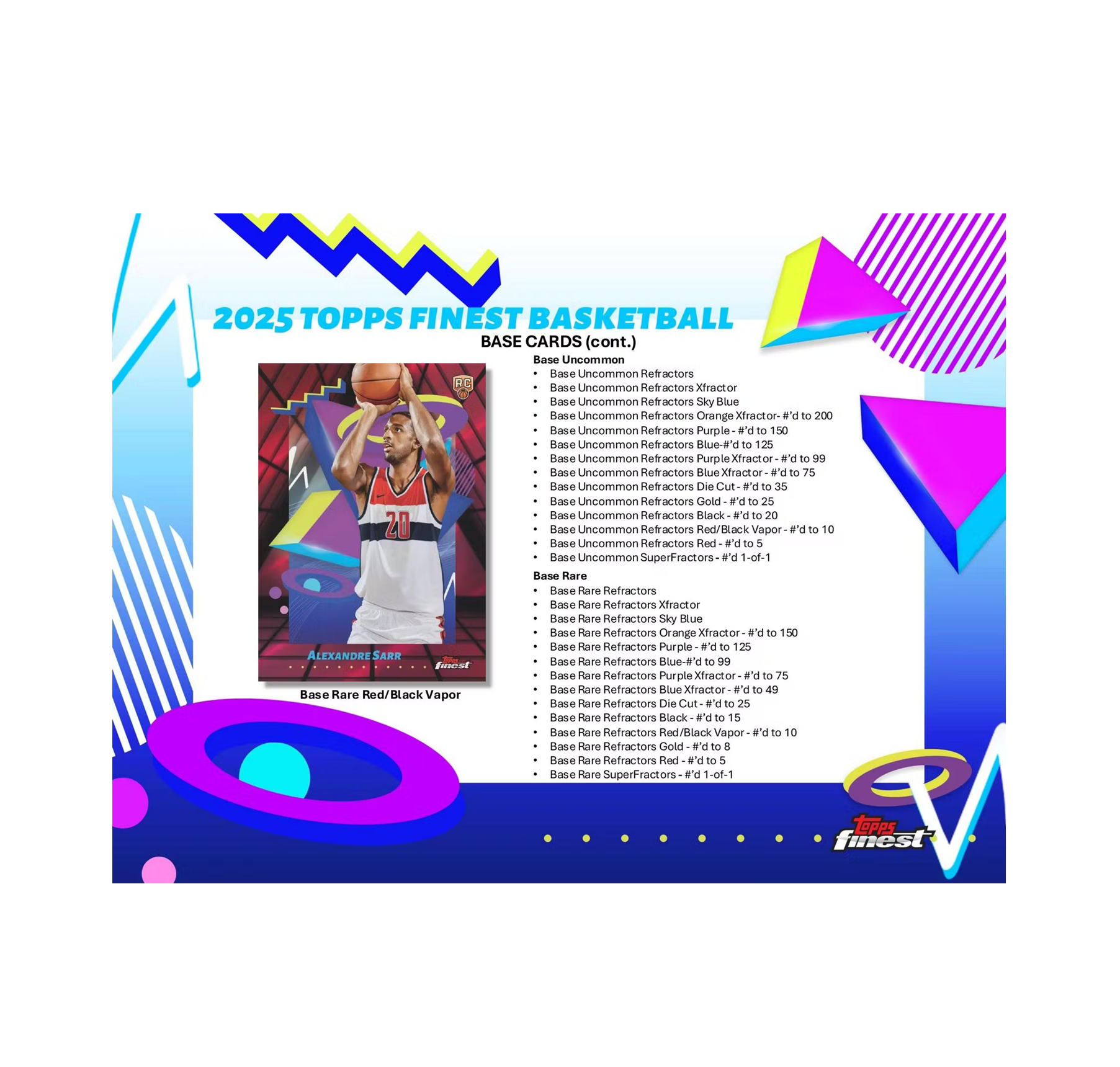 - Returning to the Hobby in 2025, Topps Finest Basketball is back! Find and collect a 100 card Base set featuring some of the top Rookie, Vets and Retired players in Basketball! - Collect each level of featured player in their Base Common, Base Uncommon, and Base rare Cards!