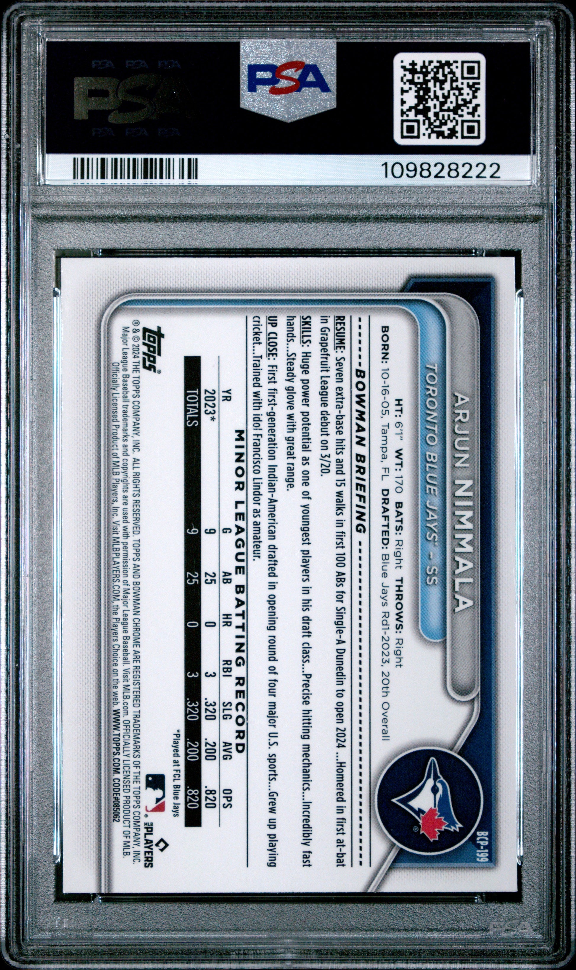 2024 Bowman Chrome Sapphire Prospects Arjun Nimmala #199 Gold 44/50 PSA 10