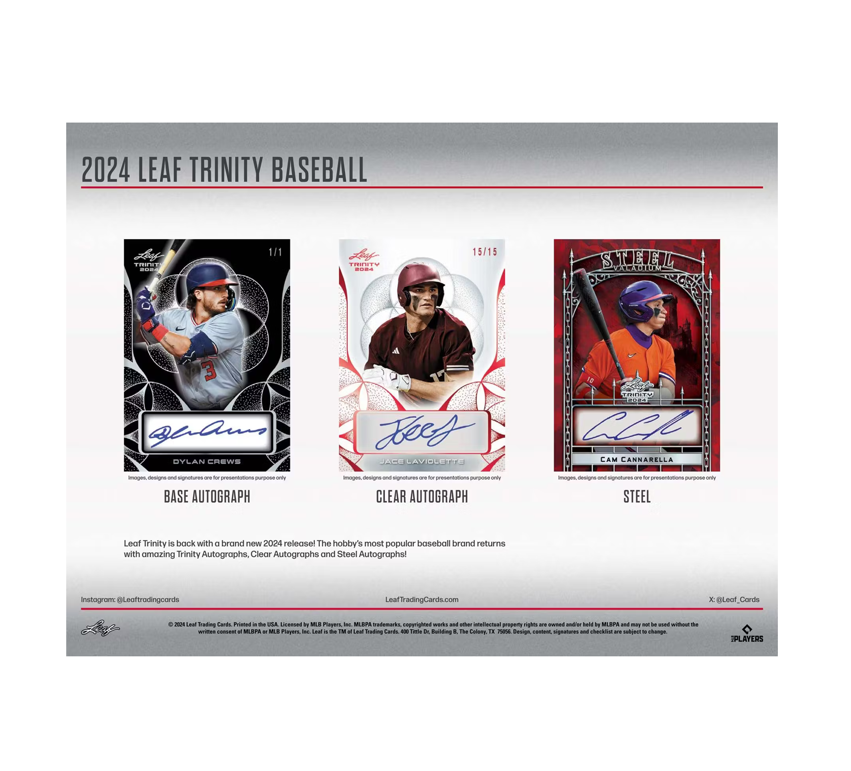 - Leaf Trinity is back with a brand new 2024 release! The hobby’s most popular baseball brand returns with amazing Trinity Autographs, Clear Autographs and Steel Autographs!
