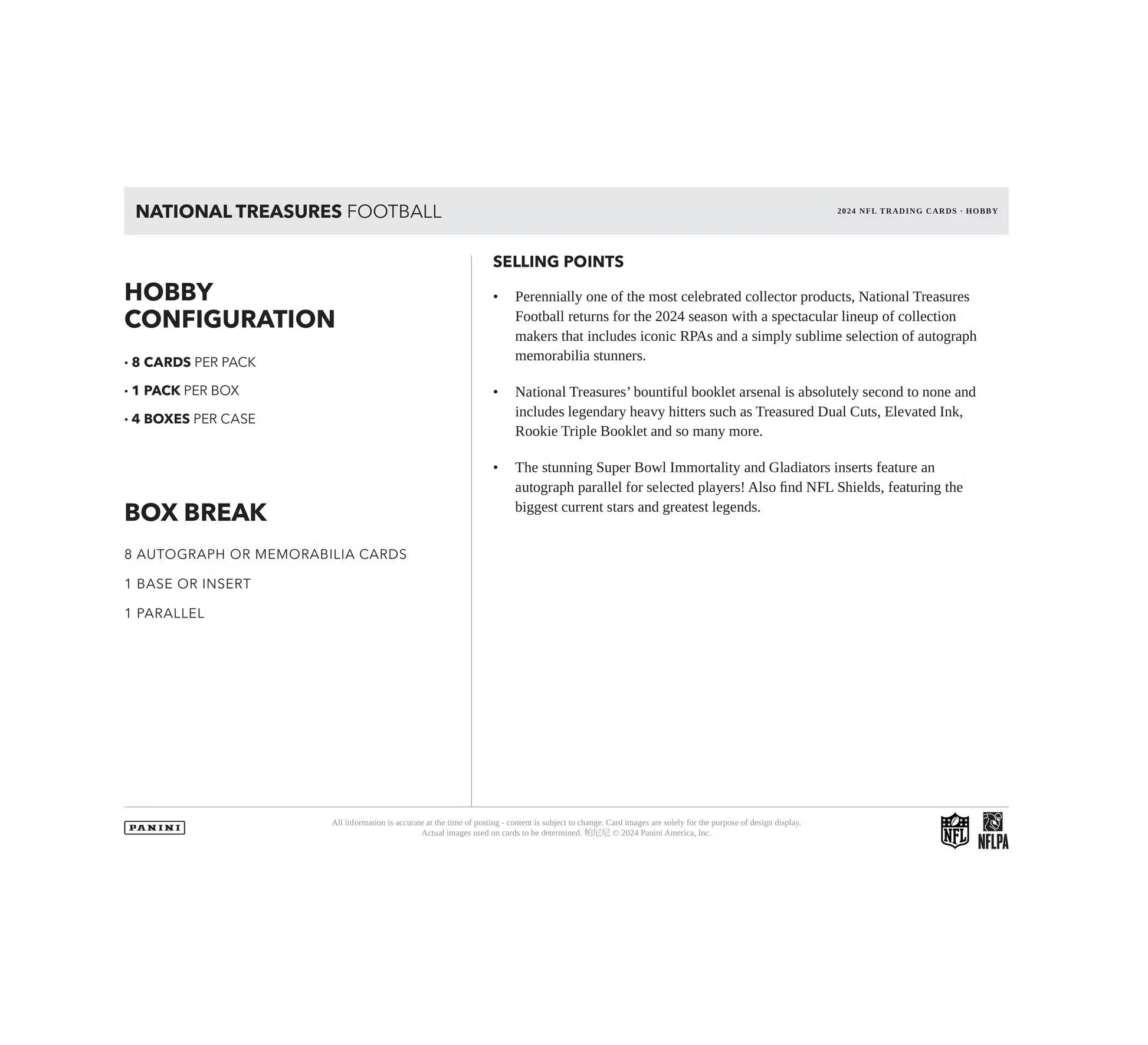 Perennially one of the most celebrated collector products, National Treasures Football returns for the 2024 season with a spectacular lineup of collection makers that includes iconic RPAs and a simply sublime selection of autograph memorabilia stunners.