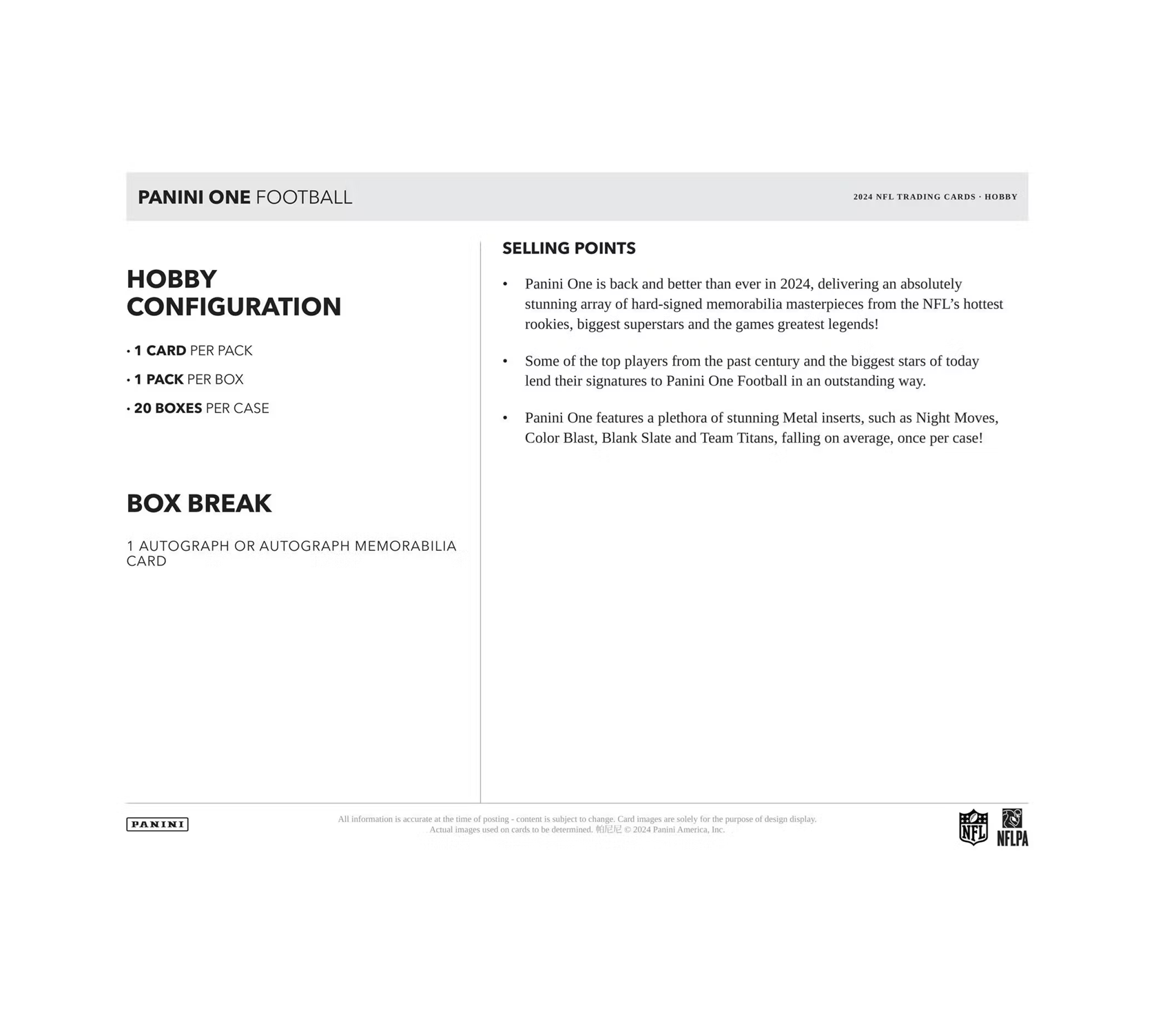 - Panini One is back and better than ever in 2024, delivering an absolutely stunning array of hard-signed memorabilia masterpieces from the NFL’s hottest rookies, biggest superstars and the games greatest legends!
