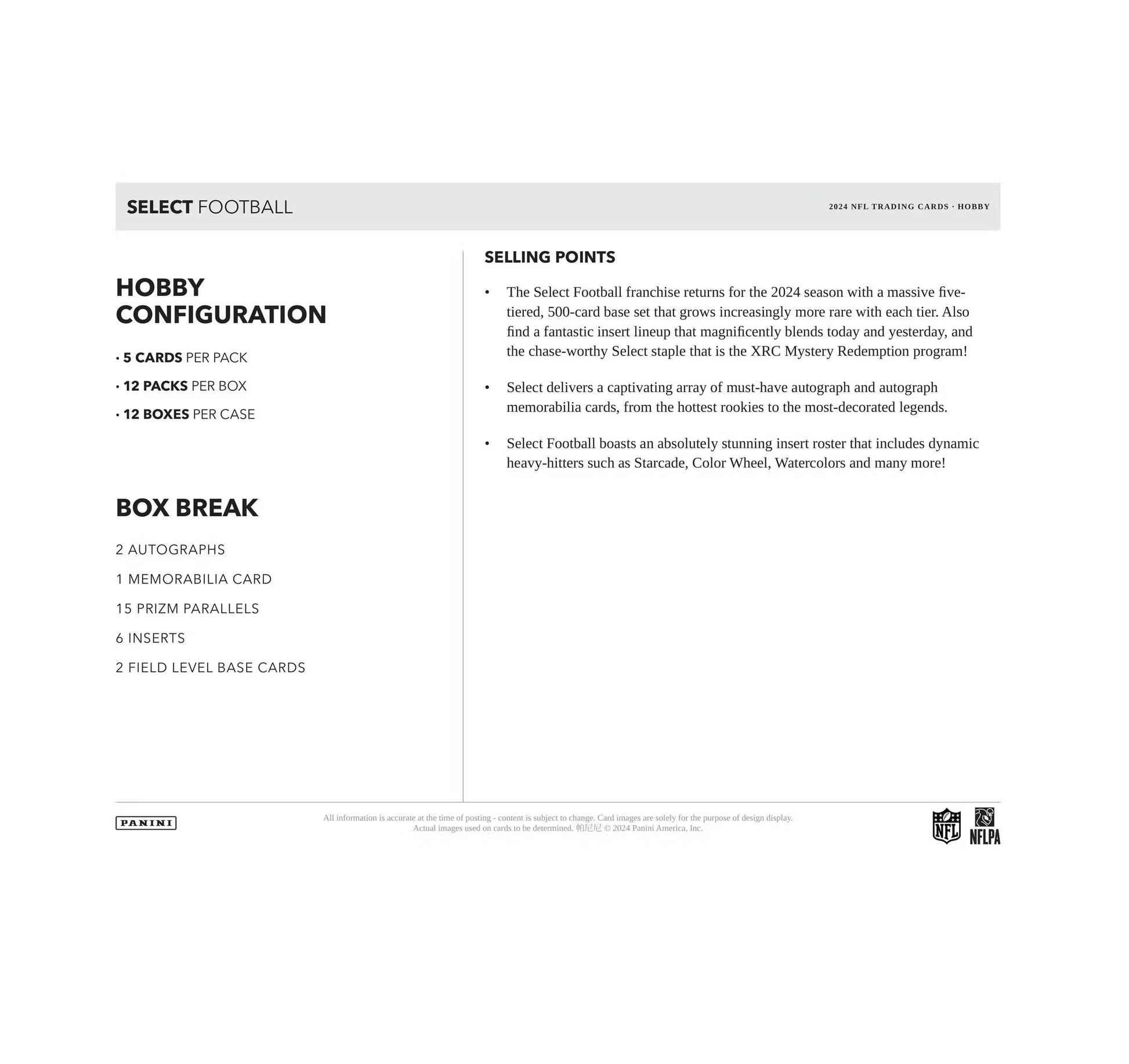 - The Select Football franchise returns for the 2024 season with a massive five-tiered, 500-card base set that grows increasingly more rare with each tier.