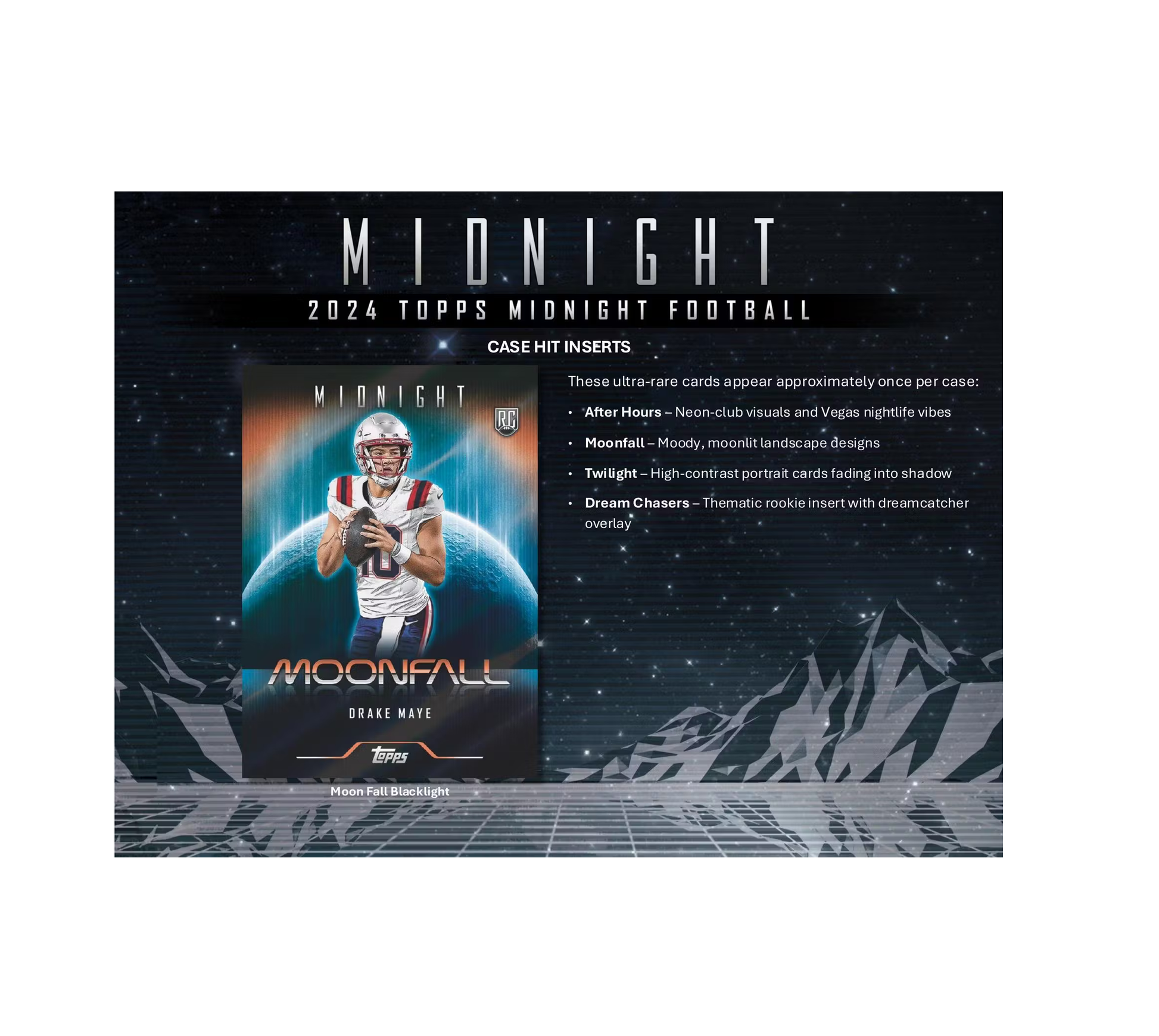 Step into the mystique of 2024 Topps Midnight Football - an all-new brand in the Topps Football lineup. Designed with bold black Chrome styling and a lunar-inspired theme, Midnight Football brings stunning contrast, rich color bursts, and ethereal artwork to the hobby.