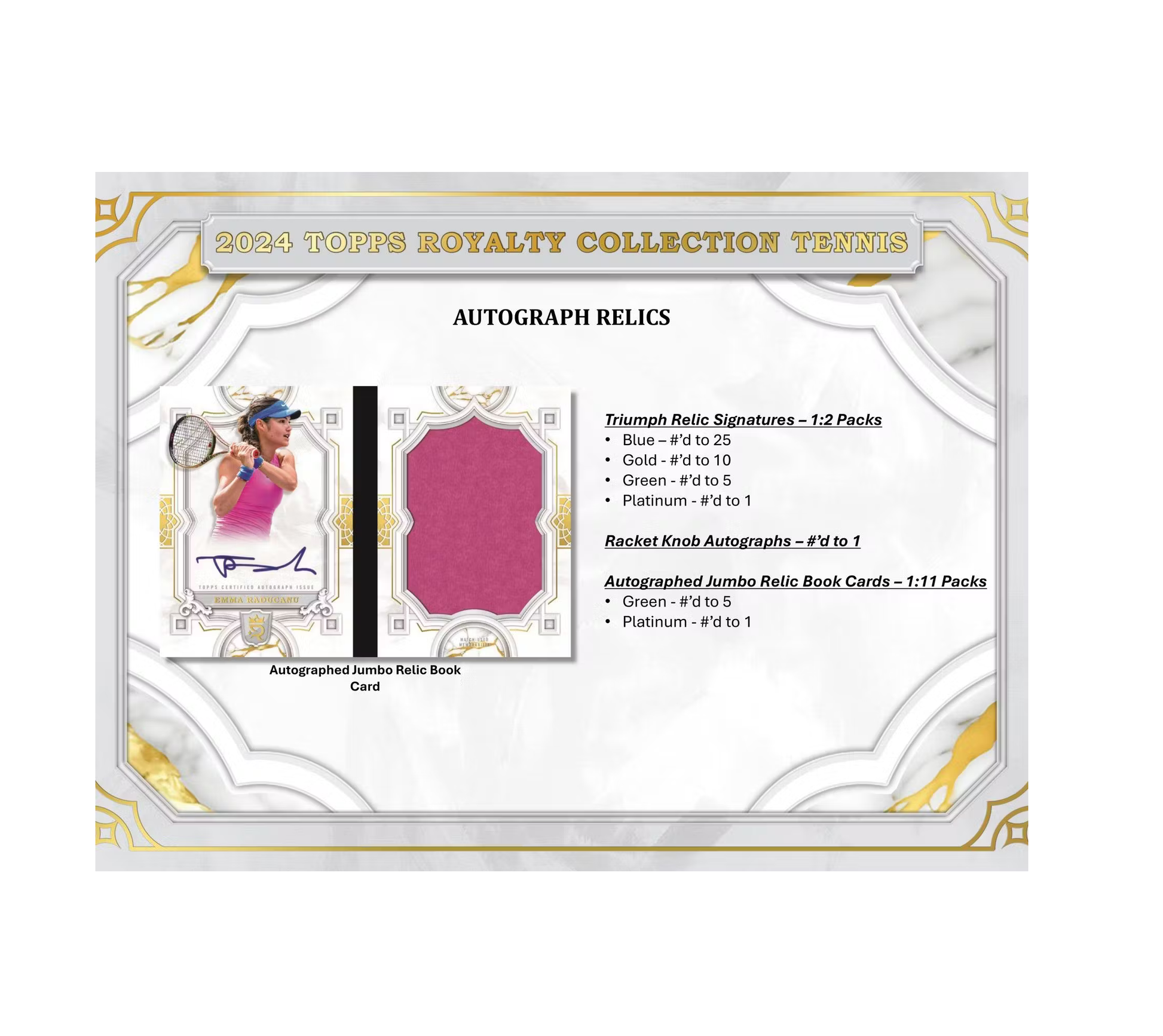 - Topps Royalty Collection Tennis makes its hobby debut featuring a collection of premium trading cards that include Relics and Autographs.
