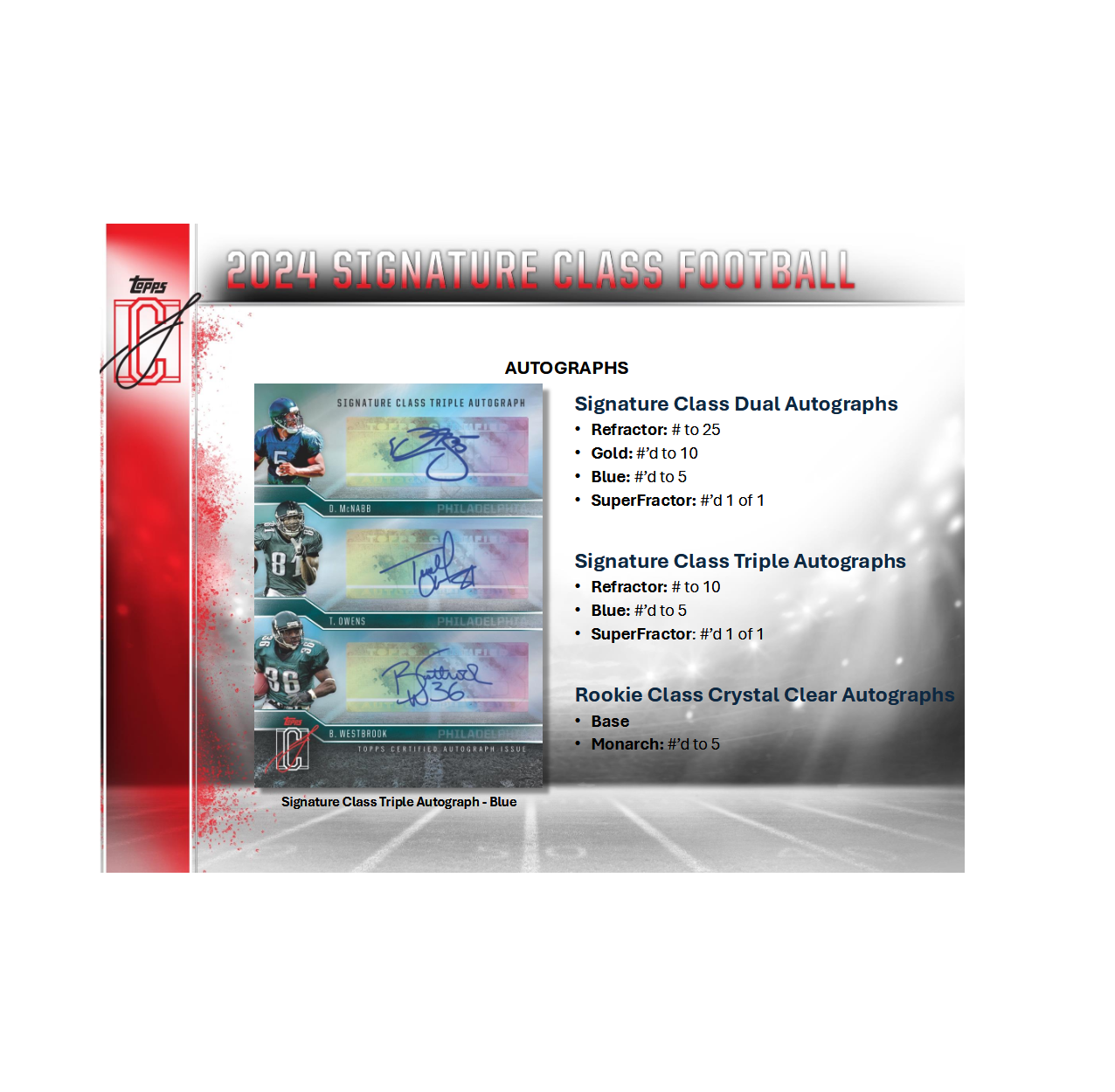 Topps Signature class is a brand-new product that brings you closer to the stars than ever before! With this loaded autograph base set, you can collect over 130 of the top rookie autographs! Look for hobby exclusive acetate and chrome autographs of the top athletes from your favorite teams!