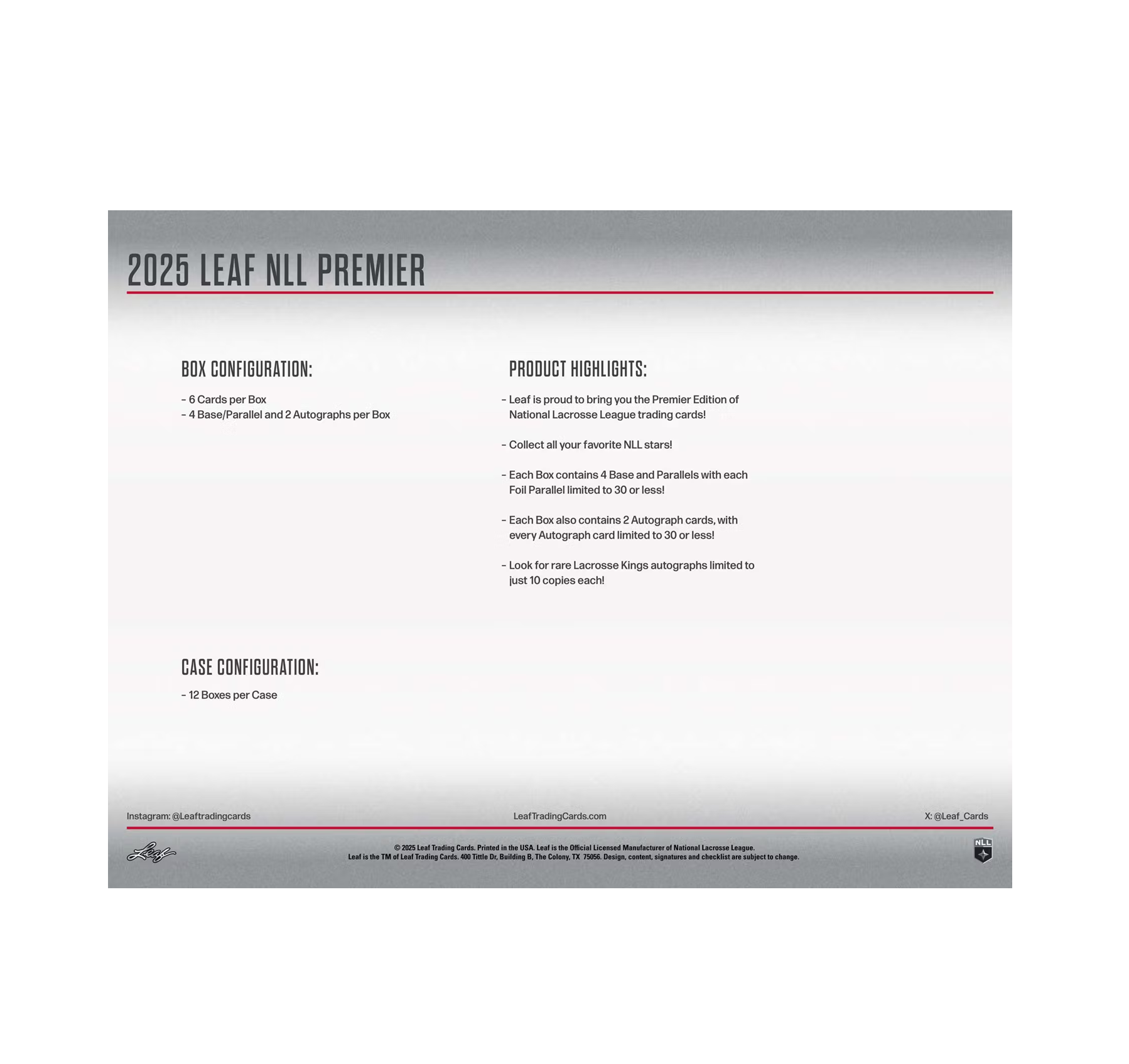 - Every Autograph in 2025 Leaf NLL Premier Edition is limited to 30 copies or less! Look for rare Lacrosse Kings inserts limited to just 10!