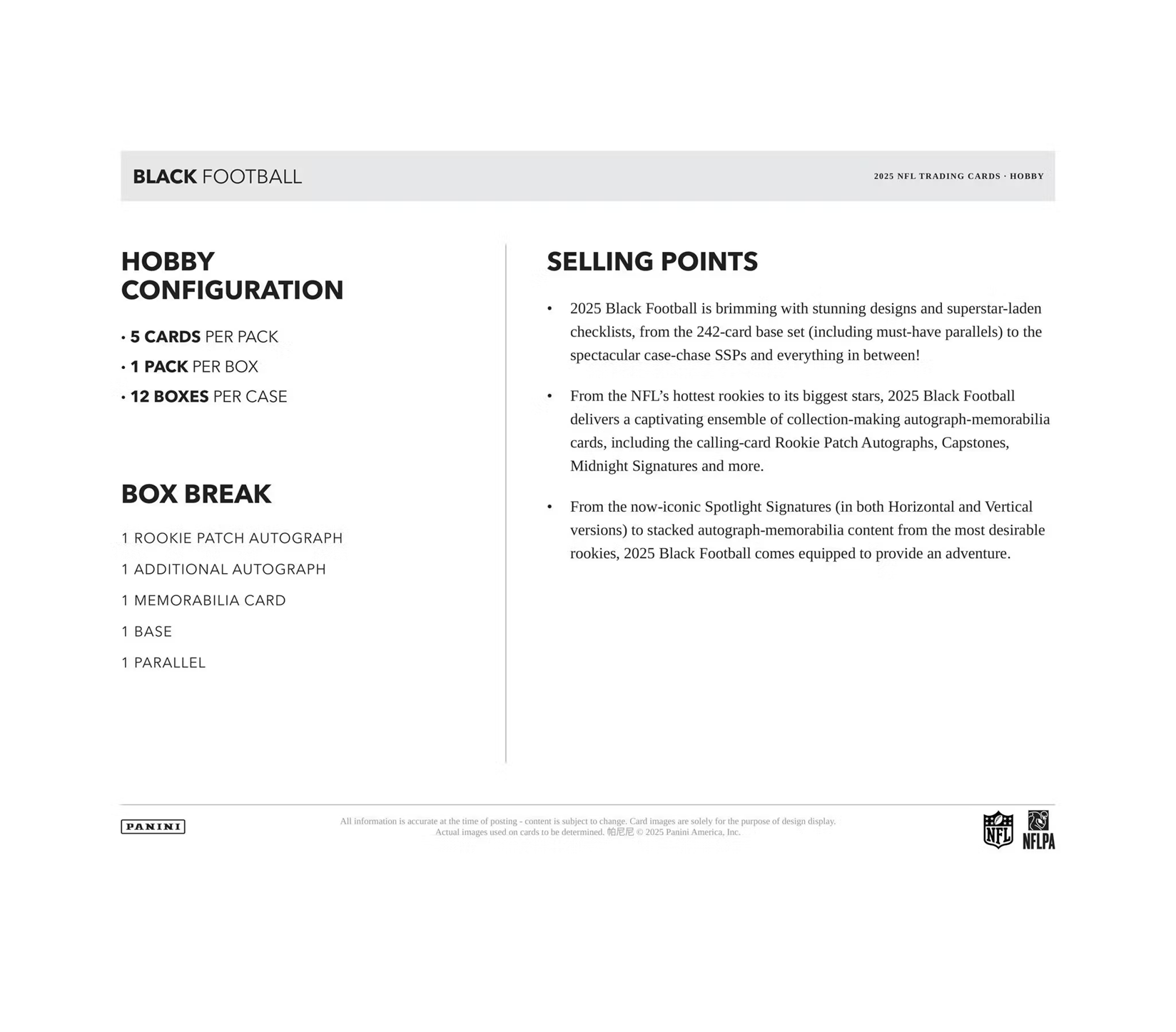 - 2025 Black Football is brimming with stunning designs and superstar-laden checklists, from the 242-card base set (including must-have parallels) to the spectacular case-chase SSPs and everything in between!