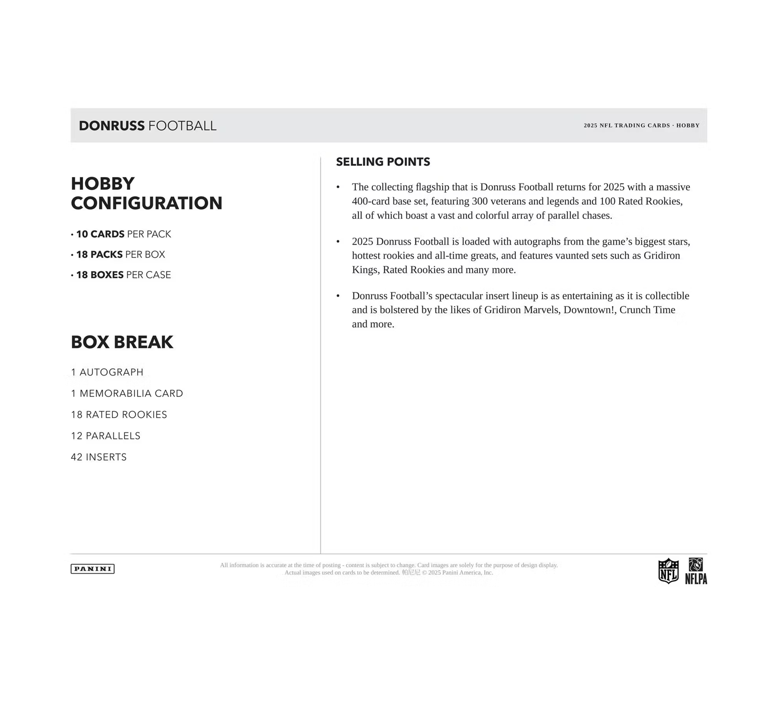 - The collecting flagship that is Donruss Football returns for 2025 with a massive 400-card base set, featuring 300 veterans and legends and 100 Rated Rookies, all of which boast a vast and colorful array of parallel chases!