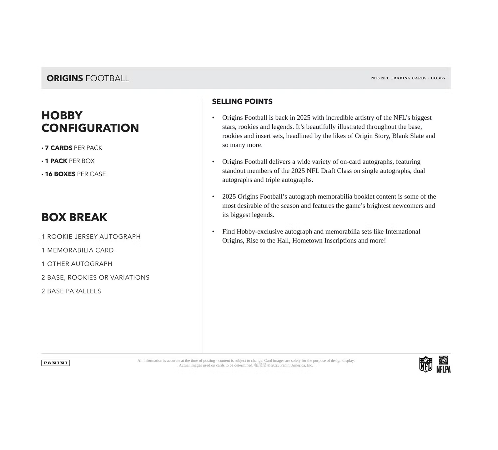 - Origins Football delivers a wide variety of on-card autographs, featuring standout members of the 2025 NFL Draft Class on single autographs, dual autographs and triple autographs! - 2025 Origins Football’s autograph memorabilia booklet content is some of the most desirable of the season and features the game’s brightest newcomers and its biggest legends!