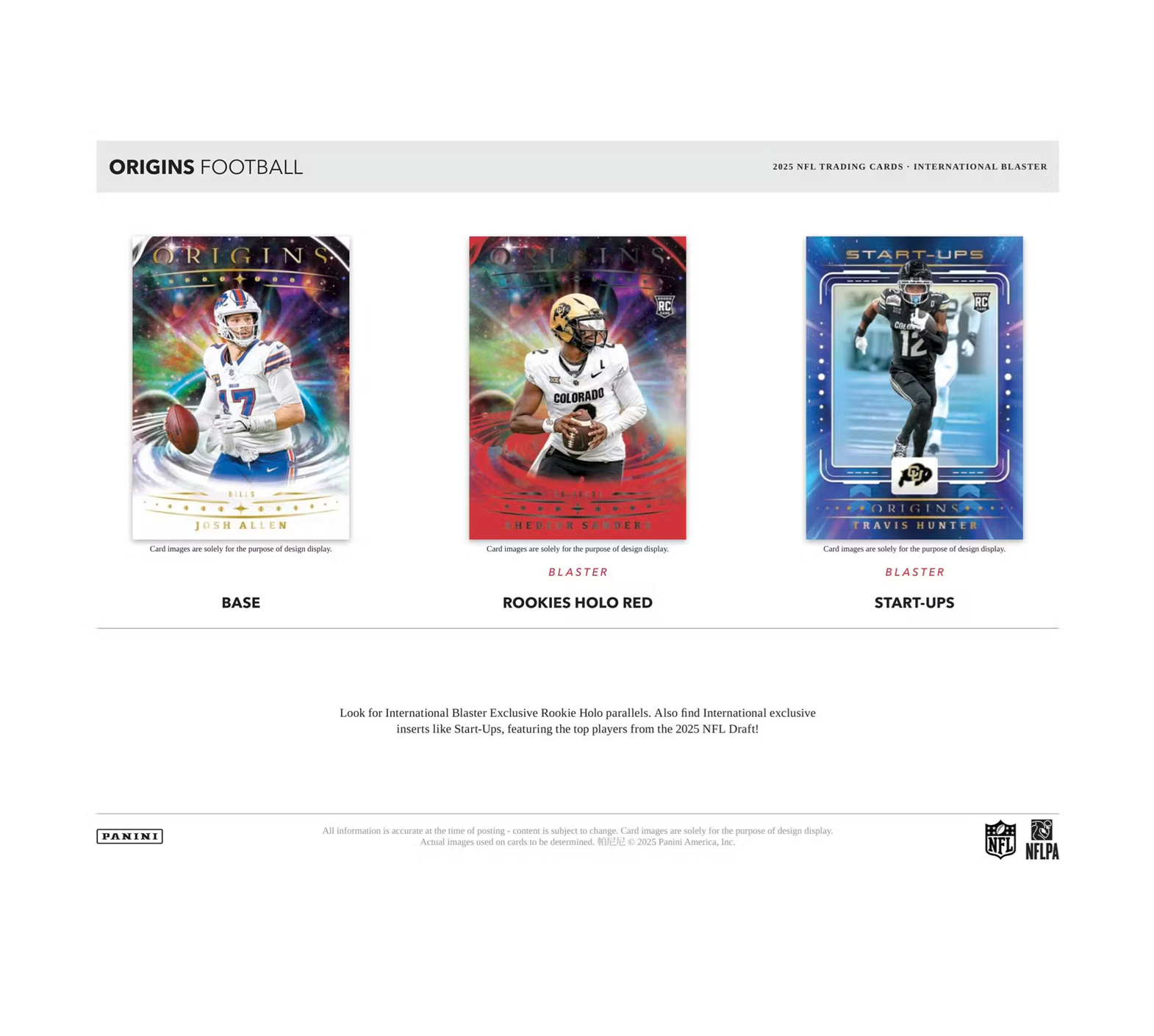 - Origins Football is back in 2025 with incredible artistry of the NFL’s biggest stars, rookies and legends. It’s beautifully illustrated throughout the base, rookies and insert sets, headlined by the likes of Original Gridiron, Big Bang and Fons et Origio!
