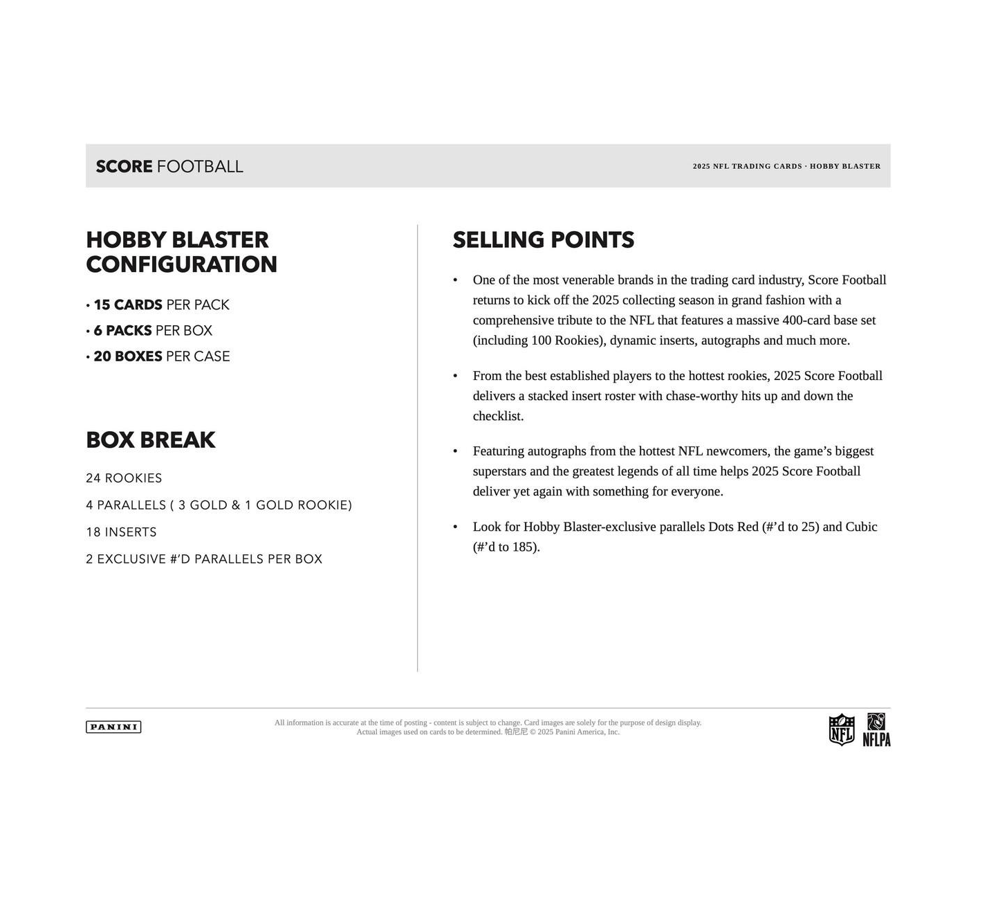 - One of the most venerable brands in the trading card industry, Score Football returns to kick off the 2025 collecting season in grand fashion with a comprehensive tribute to the NFL that features a massive 400-card base set (including 100 Rookies), dynamic inserts, autographs and much more.