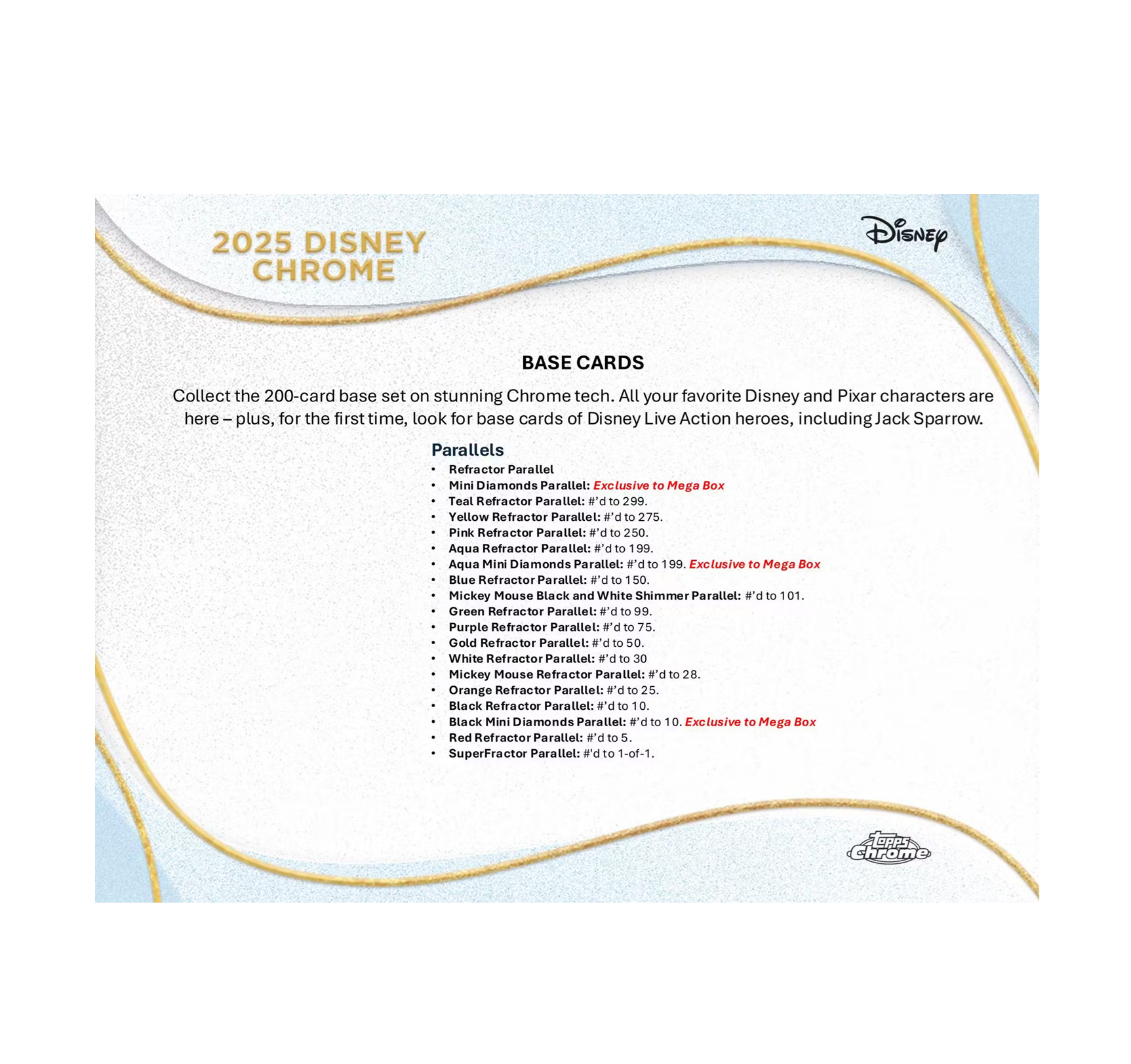 Collect the 200-card base set on stunning Chrome tech. All your favorite Disney and Pixar characters are here - plus, for the first time, look for base cards of Disney Live Action heroes. Also look out for special inserts and incredible sketch cards. This, plus much more, in 2025 Disney Chrome!