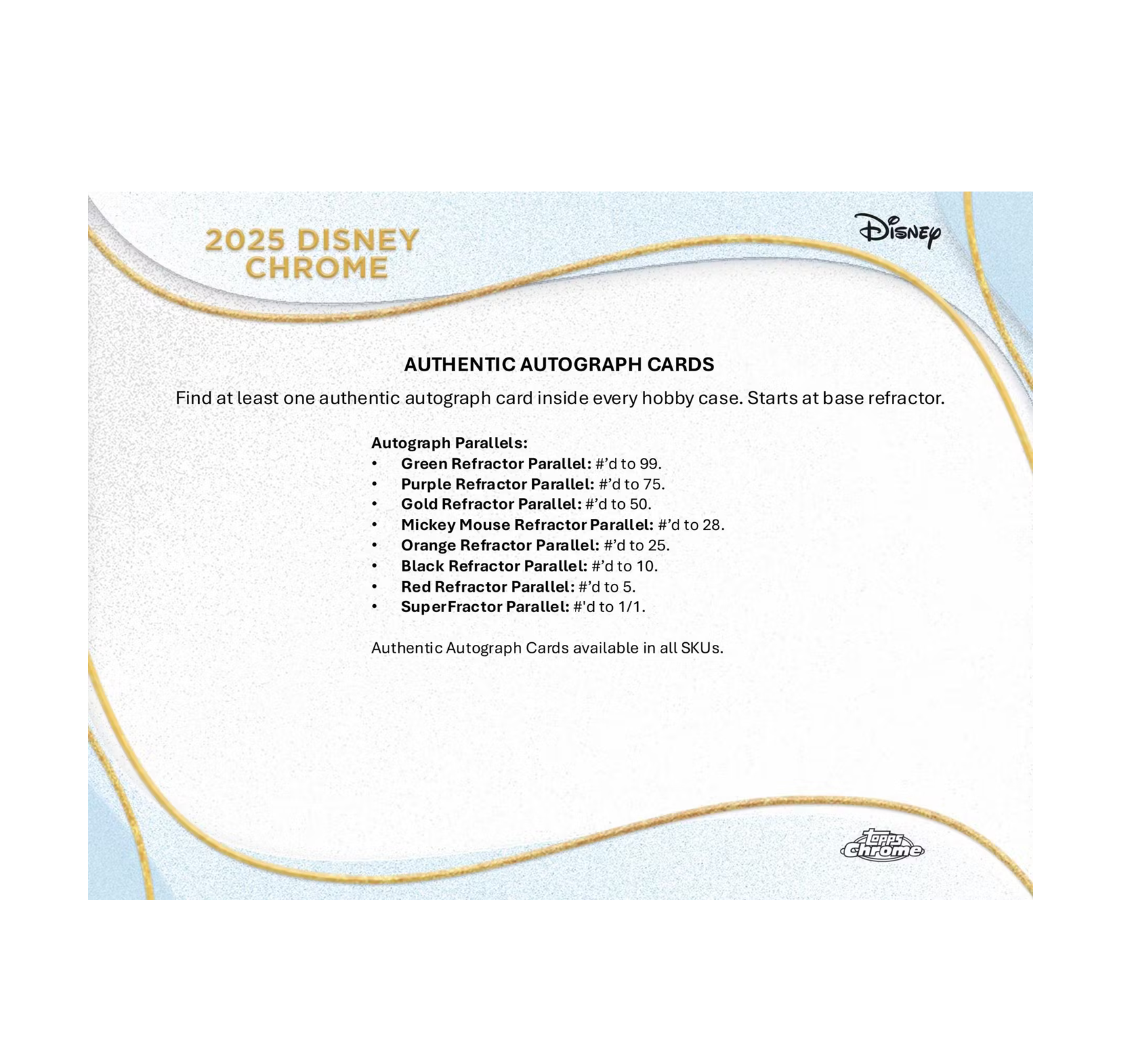 The wonder of Disney meets the magic of Topps in this all-new Disney Chrome 2025 trading card set. All your favorites are here on stunning Chrome tech and for the first time, we're proud to present rare authentic autograph cards of some of the greatest live action and voice talent from the epic history of Disney and Pixar.