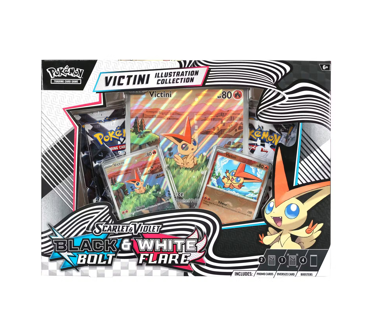 - 1 Oversize illustration rare-style foil promo card featuring Victini - 2 Pokémon TCG: Scarlet & Violet—Black Bolt booster packs